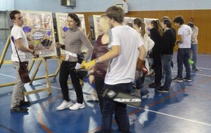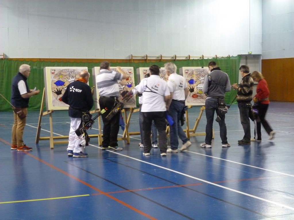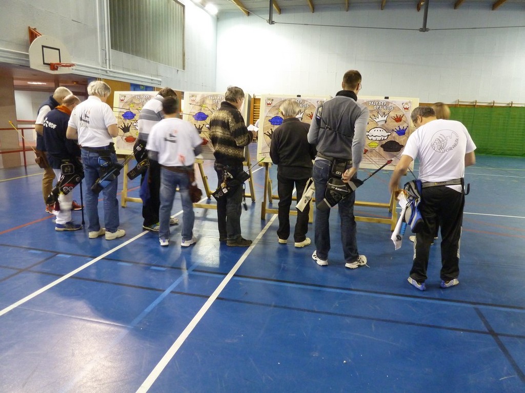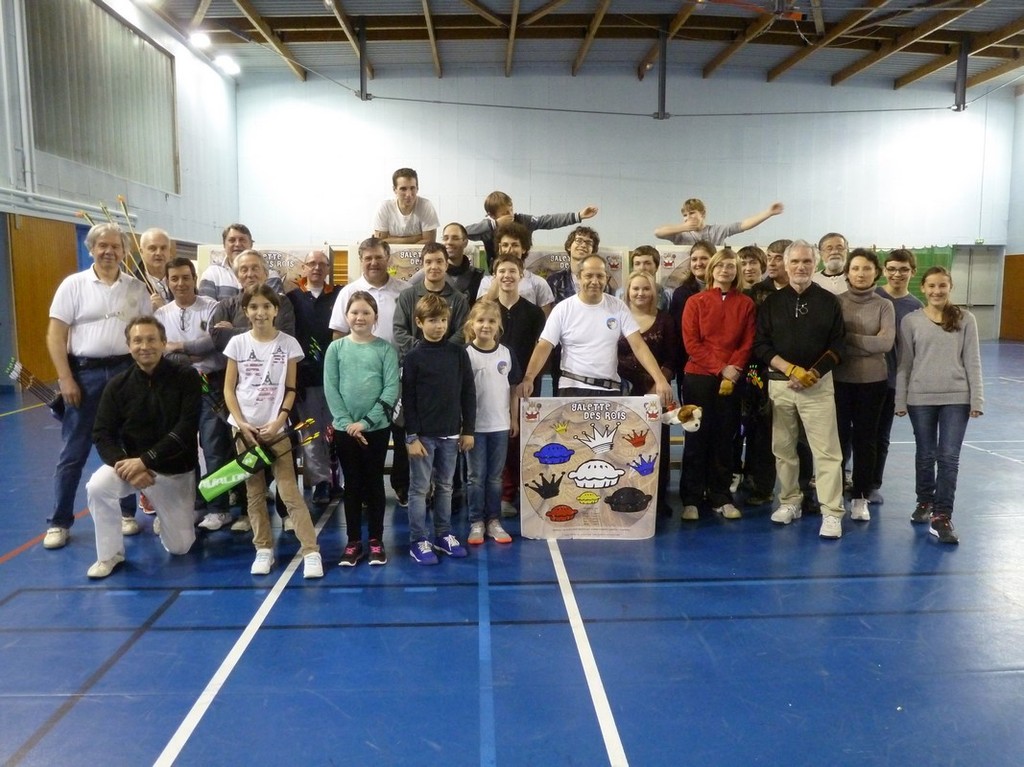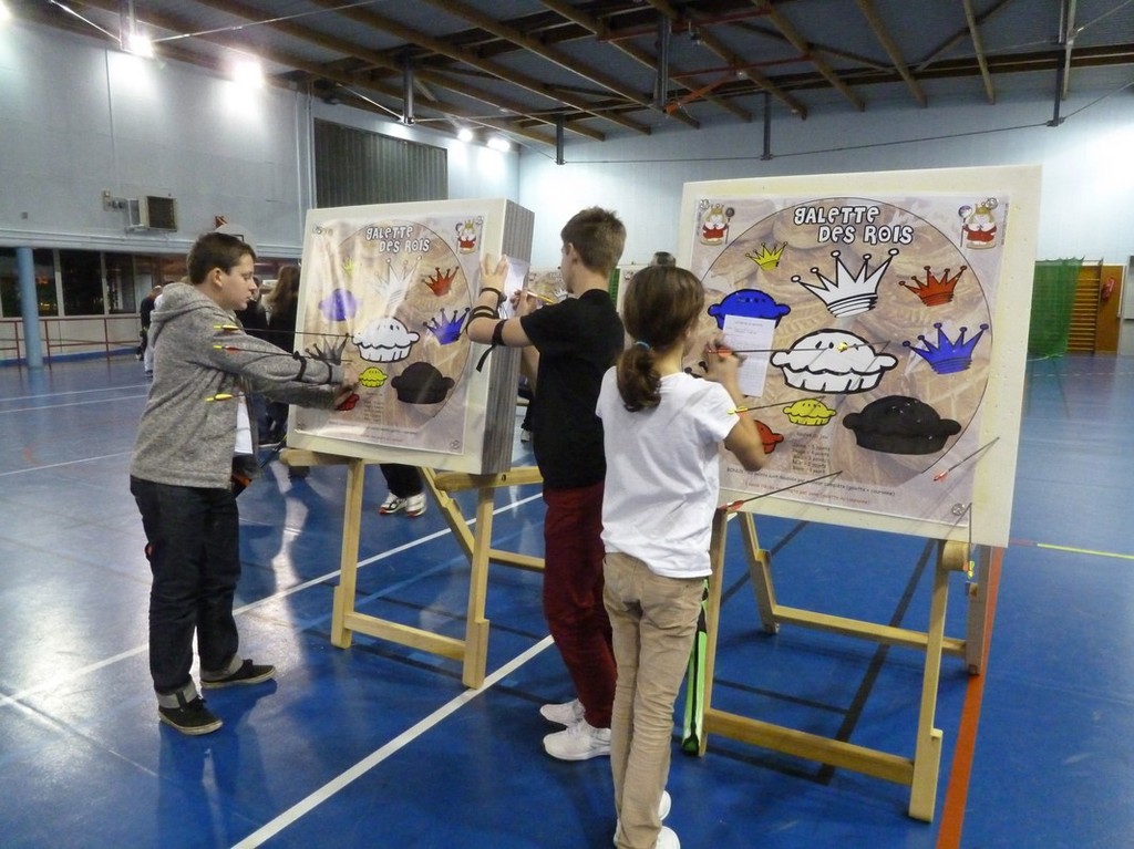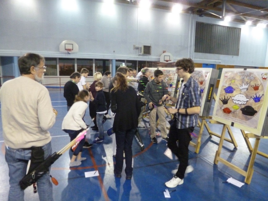 Et une galette est bien meilleure quand elle se fait attendre … car avant la dégustation, et donc le couronnement de nos nouveaux rois et reines pour l'année 2016, un petit tir ludique nous attendait : les couronnes avaient perdu leurs galettes … et celles-ci comptaient bien sûr, sur les archers pour les réunir enfin ! Mais attention, des couronnes et des galettes de couleurs différentes, et il ne fallait surtout pas se tromper en les réunissant !!